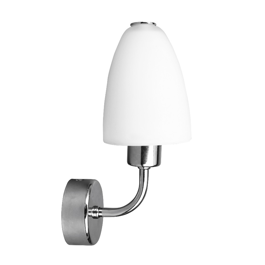 Kinkiet jest metalowy (chrom), klosz szklany biały.