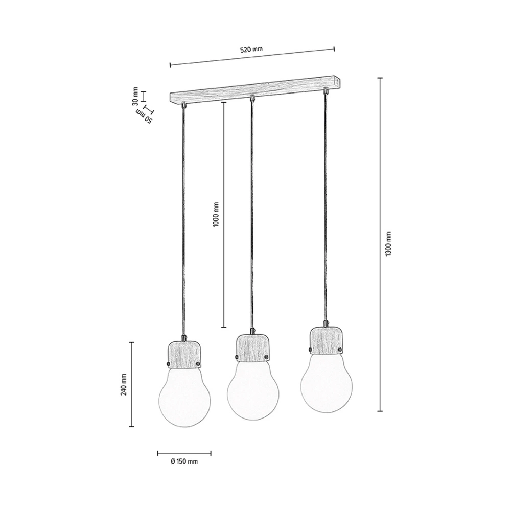 The Bulb Wood Pendant Lamp with three light sources is a striking blend of natural materials and modern design. Crafted from oiled oak, the wooden components of this pendant lamp bring a warm, organic touch to any space, while the white glass shades offer a soft diffusion of light, creating a cozy and inviting atmosphere. The transparent PVC cables add a clean, unobtrusive aesthetic, allowing the focus to remain on the elegant combination of wood and glass. With three E27 sockets, each supporting up to 60W, this pendant lamp is perfect for dining areas, kitchens, or living spaces where both style and ample illumination are desired. Its minimalist yet sophisticated design makes it a versatile piece that complements a variety of interior styles.