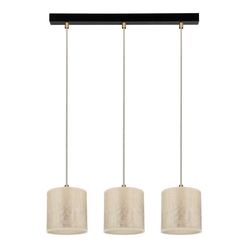 The Ora Pendant Lamp featuring three E27 sockets offers enhanced illumination with its sleek, modern design. Each socket supports up to 25W, allowing for brighter lighting and a more dynamic visual impact. The black metal structure provides a stylish, industrial look, while the transparent PVC cable ensures a clean and modern appearance. The gold fabric shades diffuse light beautifully, creating a warm, luxurious ambiance. This pendant lamp is ideal for larger spaces, such as dining areas or open-plan kitchens, where it can serve both as a functional light source and a striking design element.