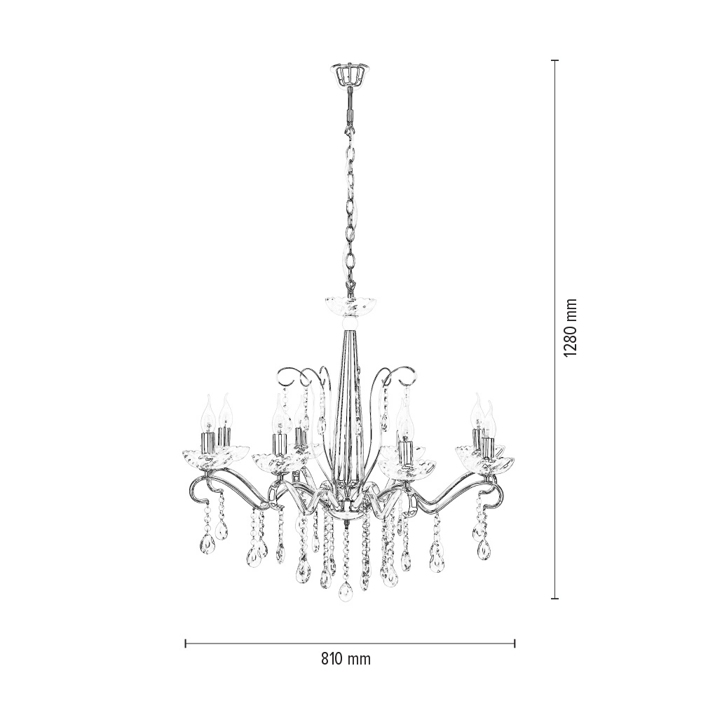 The Alessa Ceiling Lamp offers a sophisticated lighting solution with its stylish chrome metal frame and transparent glass shades. Accommodating up to eight E14 bulbs (max. 40W each), this fixture provides ample illumination while adding a touch of glamour to any space. Its versatile design makes it suitable for modern or traditional settings, perfect for large rooms or dining areas where elegance and brightness are desired.