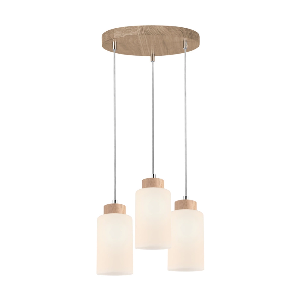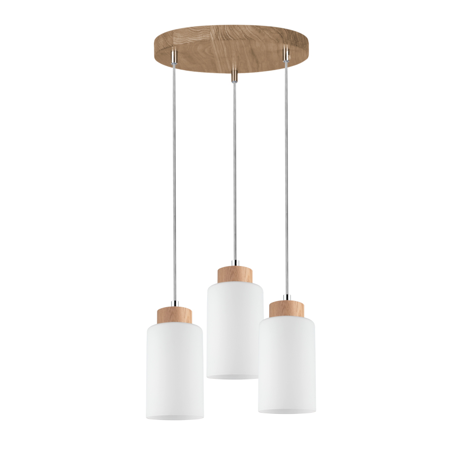 Lampa wisząca Bosco jest lampą 3 punktową o max. mocy 60 W każdy, zakończona szklanymi białymi kloszami. Elementy drewniane wykonane z drewna dębowego w kolorze dąb olejowany. Istnieje możliwość skrócenia wysokości lampy. Kabel jest w kolorze transparentnym.