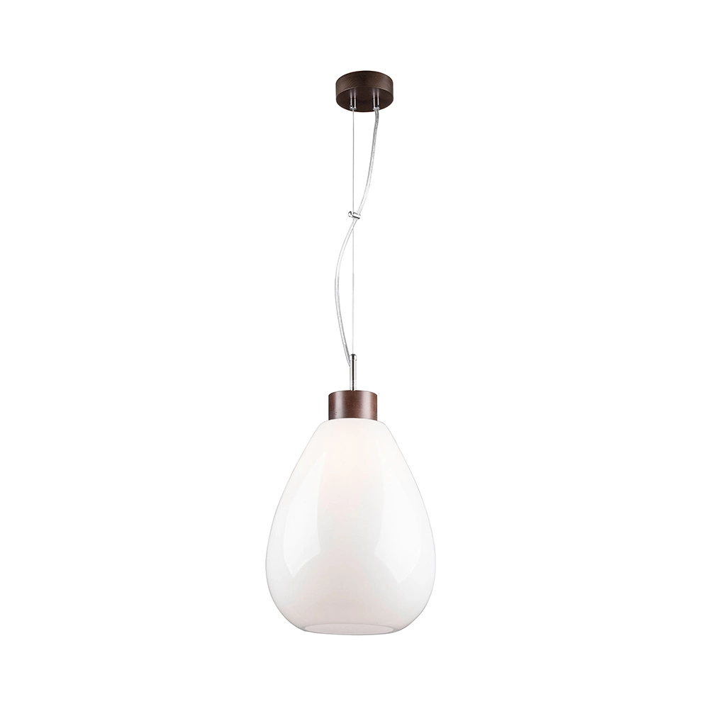 Lampa wisząca Piro łączy naturalne piękno drewna bukowego w orzechowym odcieniu z elegancją białego szkła, Jedno źródło światła E27 o maksymalnej mocy 60W dostarcza miękkie, ale skuteczne oświetlenie, idealne dla mniejszych przestrzeni takich jak sypialnia czy kącik do czytania, Transparentny kabel PVC dodaje nowoczesnego akcentu, podczas gdy białe szkło wprowadza do wnętrza subtelne refleksy świetlne i elegancką atmosferę, Piro to doskonałe połączenie naturalnego uroku i współczesnego stylu,