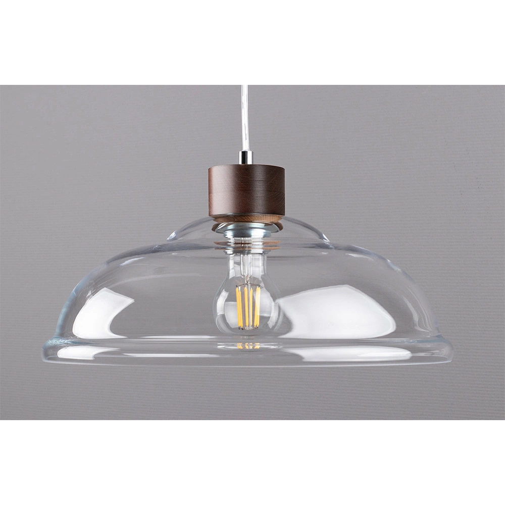 Lampa wisząca Molde łączy ciepło drewna bukowego w orzechowym odcieniu z nowoczesnym designem transparentnego szkła, Jedno źródło światła E27 o maksymalnej mocy 60W zapewnia efektywne i równomierne oświetlenie, idealne do mniejszych przestrzeni takich jak kuchnia czy jadalnia, Transparentny kabel PVC dodaje nowoczesnego akcentu, a transparentne szkło subtelnie rozprasza światło, tworząc elegancką i przytulną atmosferę, Molde to harmonijne połączenie naturalnego uroku drewna i nowoczesnego stylu,