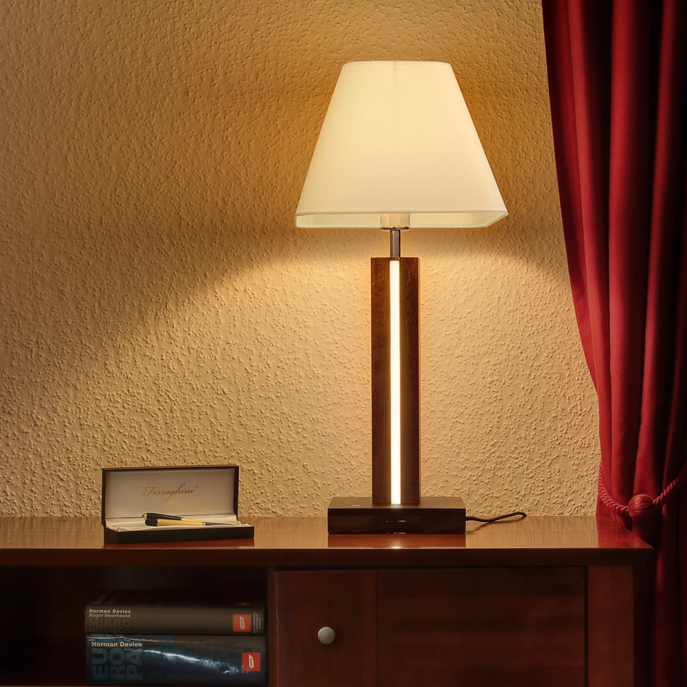 Producent nie przeszedł obojętnie również obok designu lampy. Biały, subtelny abażur został połączony z podstawą z drewna bukowego orzechowego. Całość kontrastuje ze sobą, zapewniając elegancki i wyrafinowany efekt. Dzięki temu możesz mieć pewność, że lampa Twin stanie się nie tylko źródłem światła, ale również unikalną dekoracją w Twoim domu.